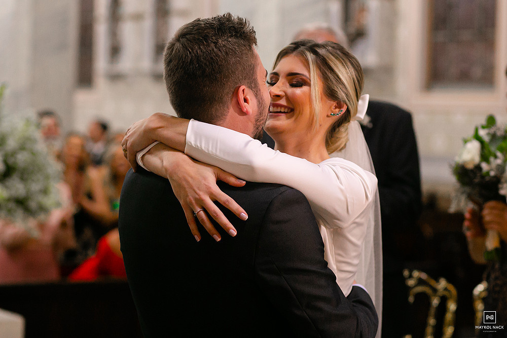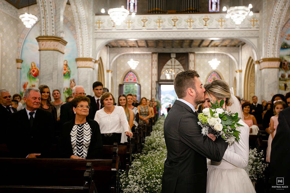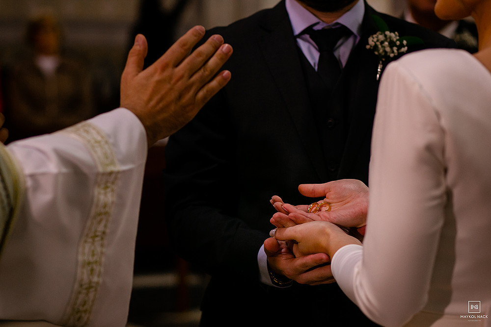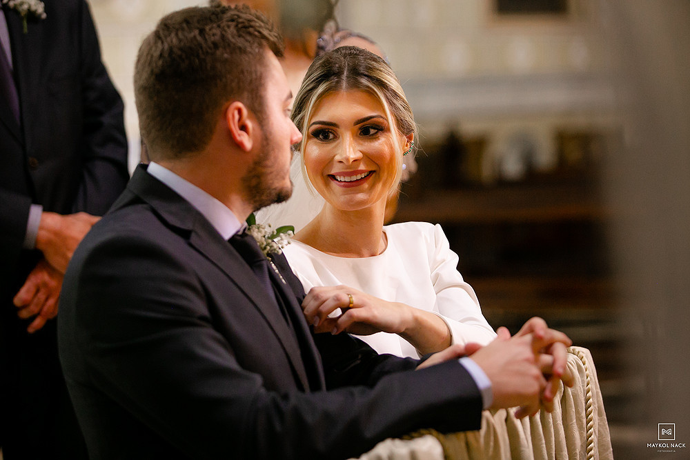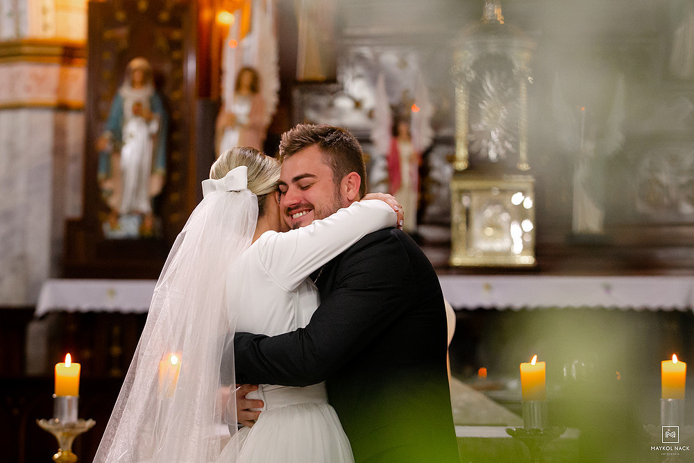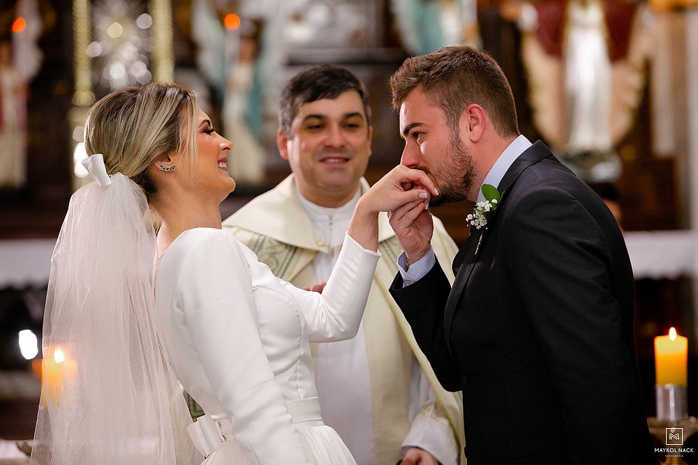 A cerimônia na Igreja Matriz Nosso Senhor do Bonfim, em Braço do Norte/SC, começou no final do dia, e terminou ao anoitecer. Um momento muito esperado, que foi marcado por sorrisos e lágrimas de alegria. É só conferir a expressão da Karol e do Edu após eles trocarem as alianças. O sentimento fala mais alto, e o sorriso vem de forma espontânea e contagiante.
