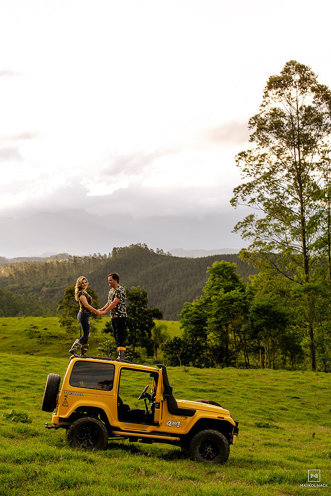 Para o ensaio, fotografamos em uma tarde alegre em Grão-Pará, desde a casa deles, até fotos bem off-road, com a Troller e a Dyeni e o Gui mostrando uma de suas paixões. Fomos para o meio do mato com eles, (ow loko!!!) hahaha ... e fotografamos fotos que retratam bem essa diversão deles.